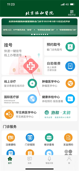 1、打開北京協(xié)和醫(yī)院APP,在首頁點(diǎn)擊掛號選項(xiàng)。