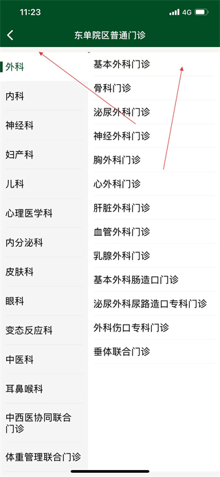 3、進(jìn)入東單院區(qū)普通門診頁面,選擇科室,再選擇具體門診。