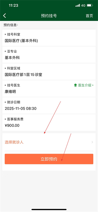 6、在預(yù)約掛號頁面選擇就診人后,點(diǎn)擊立即預(yù)約,即可完成掛號操作。