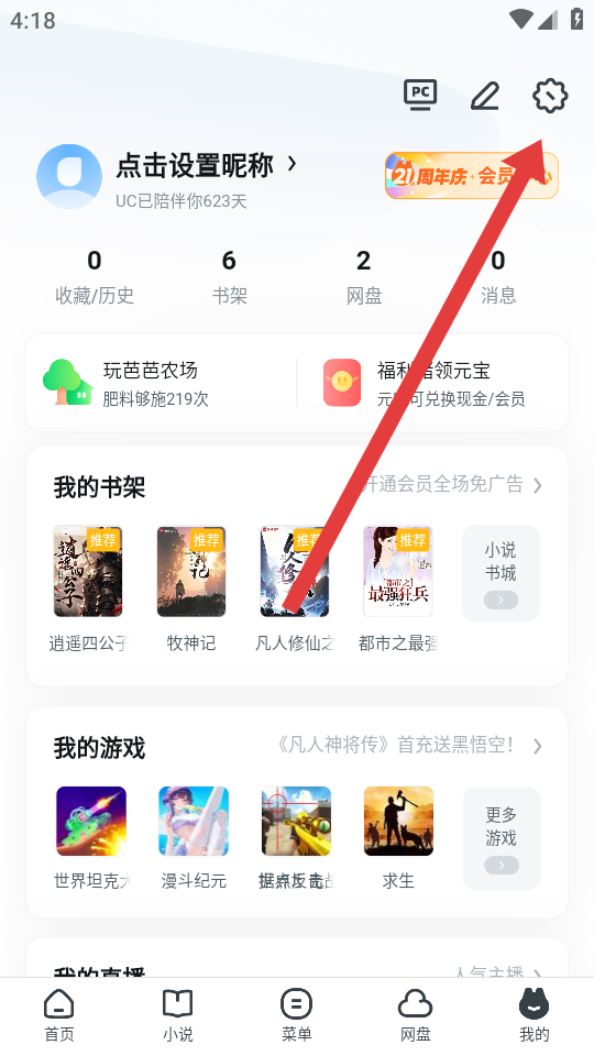 1、進(jìn)入UC瀏覽器我的頁面,點擊右上角設(shè)置圖標(biāo),進(jìn)入設(shè)置的界面。
