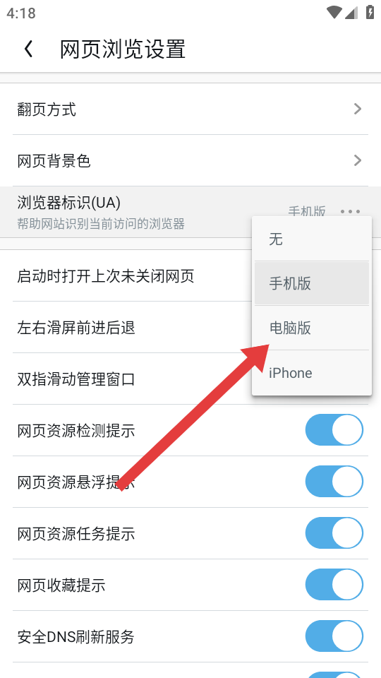 3、在網(wǎng)頁瀏覽設(shè)置頁面內(nèi),點擊瀏覽器標(biāo)識的下拉菜單并選擇電腦版,就可以切換為電腦版瀏覽模式。