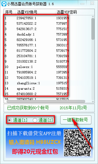 2、選擇通道,在點擊一鍵獲取帳號即可.