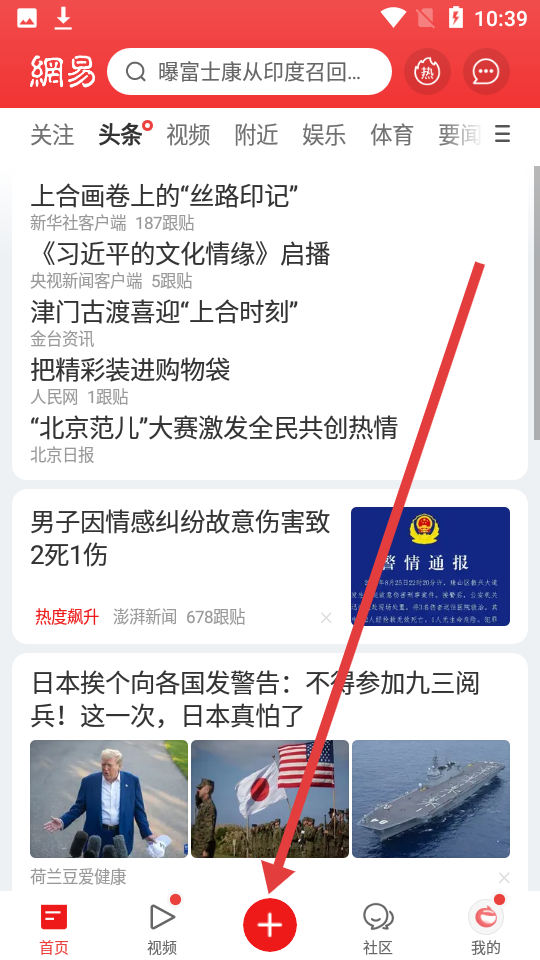 1、打開網(wǎng)易新聞APP之后,找到主頁底部導(dǎo)航欄中間的紅色加號按鈕,點擊進入。