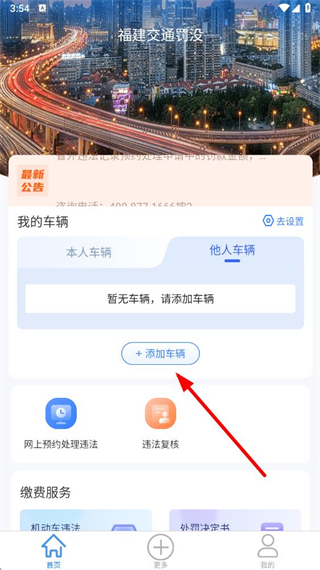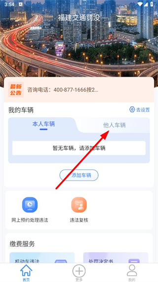 1、打開福建交通罰沒app,在我的車輛區(qū)域點擊他人車輛選項。