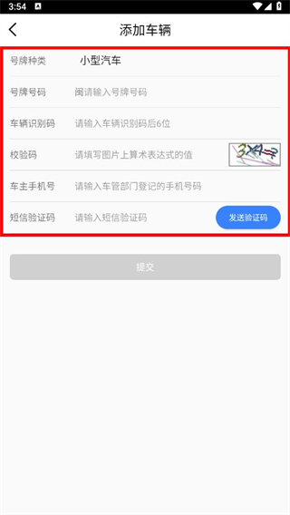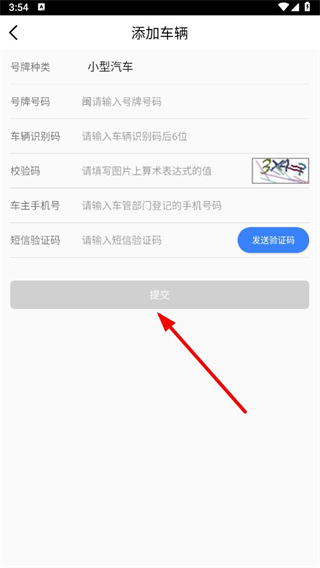 3、在添加車輛頁面,填寫號牌種類、號牌號碼、車輛識別碼后6位、校驗碼、車主手機號及短信驗證碼等信息。
