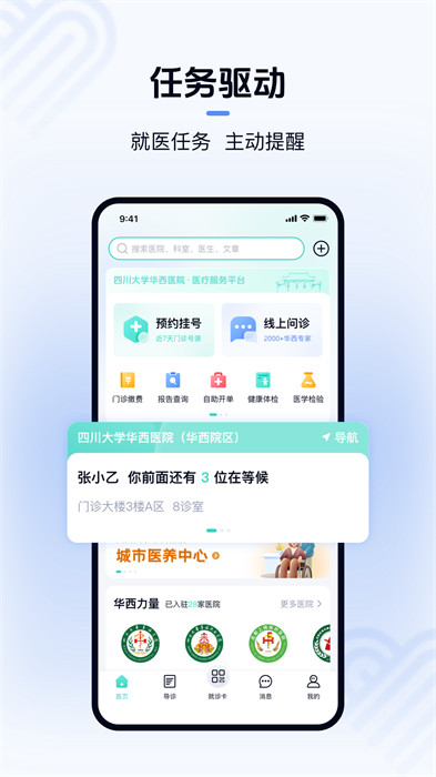 華西醫(yī)院掛號(hào)app(華醫(yī)通)是一款集診前咨詢(xún)、診中就醫(yī)、診間支付等功能為一體的移動(dòng)客戶(hù)端,通過(guò)醫(yī)患實(shí)時(shí)交互實(shí)現(xiàn)便捷、高效的全流程就醫(yī)服務(wù)。主要為患者用戶(hù)提供癥狀自查、預(yù)約掛號(hào)、就診提醒、候診查詢(xún)、門(mén)診繳費(fèi)、導(dǎo)航導(dǎo)診等功能。