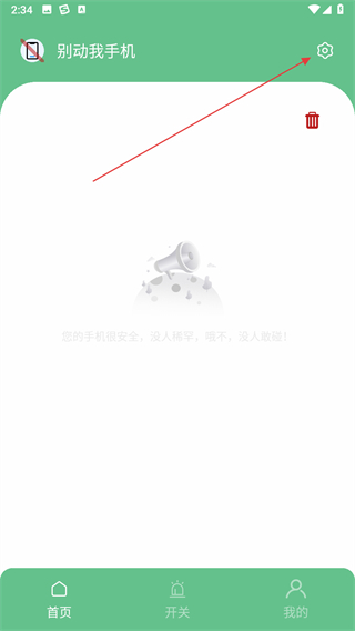 1、打開別動我手機(jī)應(yīng)用,在首頁點(diǎn)擊右上角的齒輪設(shè)置圖標(biāo)。
