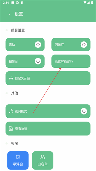 2、在設(shè)置頁面的報警設(shè)置欄,點(diǎn)擊設(shè)置解鎖密碼選項。