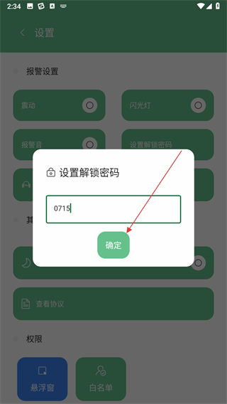 3、點(diǎn)擊設(shè)置解鎖密碼后,輸入想要設(shè)置的密碼,點(diǎn)擊確定。