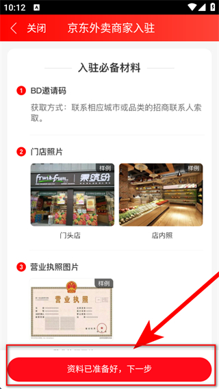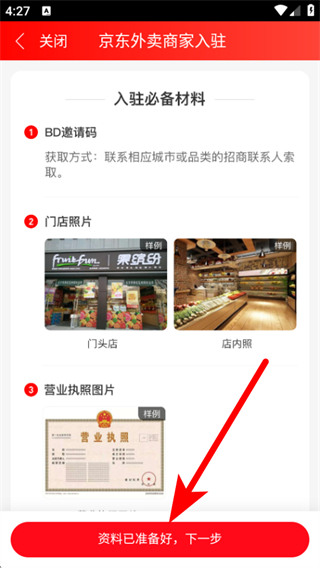 2、進入京東外賣商家入駐流程,點擊資料已準備好,下一步。