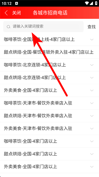 4、在頁面,可通過頂部搜索框輸入關(guān)鍵詞查找對應城市或品類的招商電話。