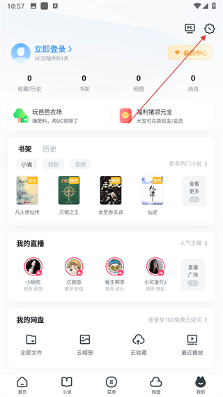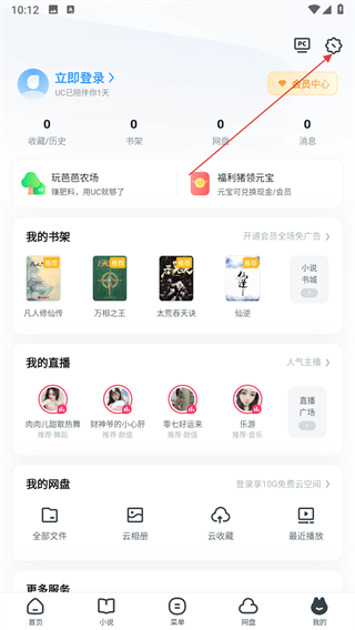 1、打開UC瀏覽器,進(jìn)入我的頁面后點(diǎn)擊右上角設(shè)置圖標(biāo)。