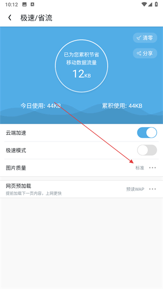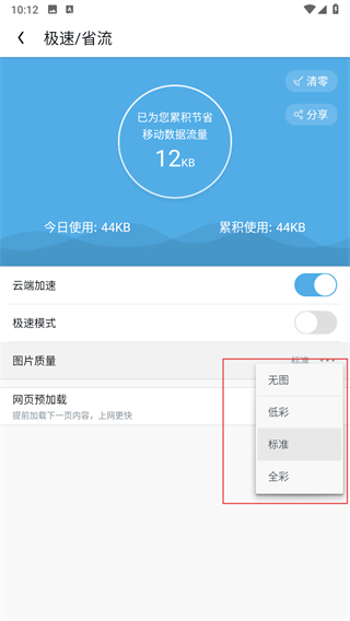 3、在極速/省流設(shè)置頁面找到圖片質(zhì)量選項(xiàng),點(diǎn)擊按鈕,彈出選擇菜單。