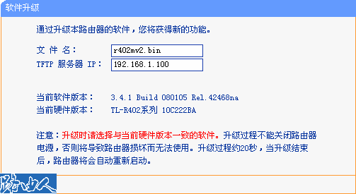 大部分型號路由器采用WEB頁面升級的方式,TFTP針對使用TL-R402系列路由器用戶的升級。