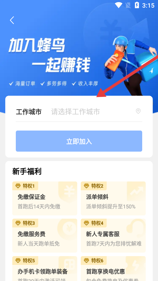 1、下載餓了么眾包最新版本,進入頁面后選定工作城市,點擊立即加入,啟動餓了么送餐員報名流程。