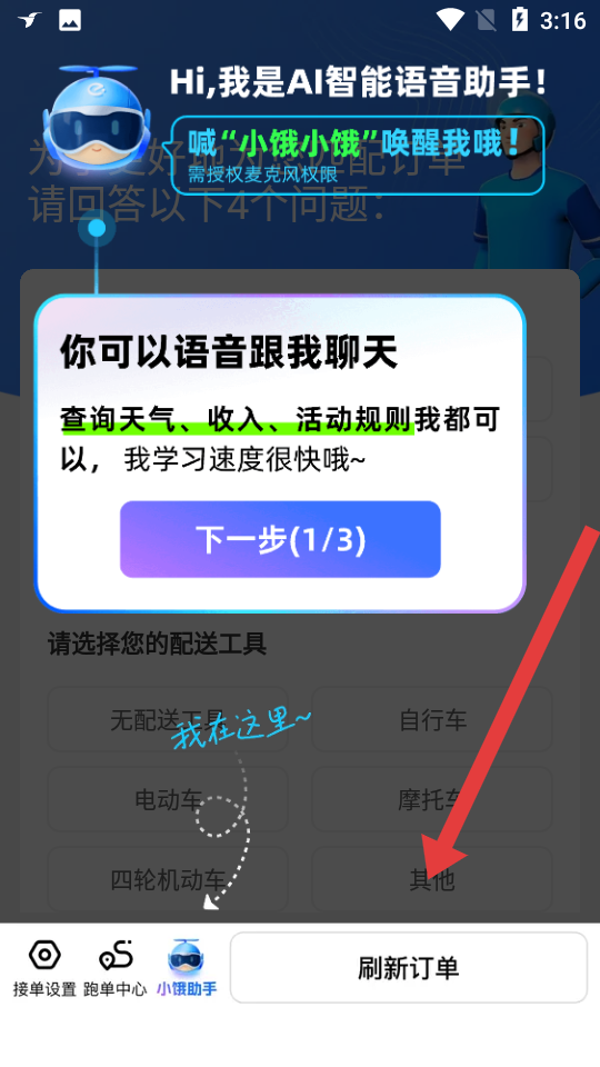 2、完成賬號注冊與實名認證,授權(quán)麥克風(fēng)權(quán)限喚醒小餓小餓智能助手,接著點擊智能助手的下一步,完成后可以點擊刷新訂單。
