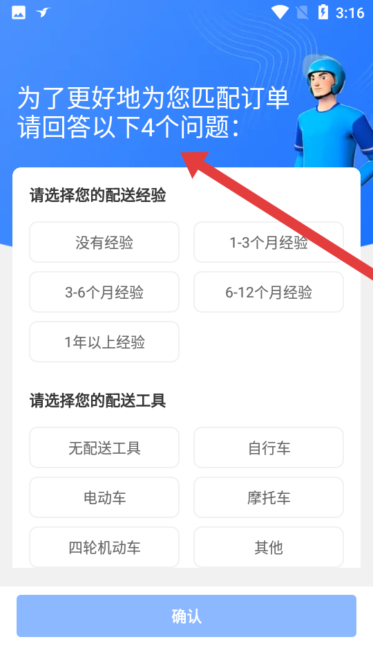 3、填寫配送經(jīng)驗如無經(jīng)驗、1-3個月經(jīng)驗等選項與配送工具信息,確認提交,待審核通過后即可開展接單送餐工作。