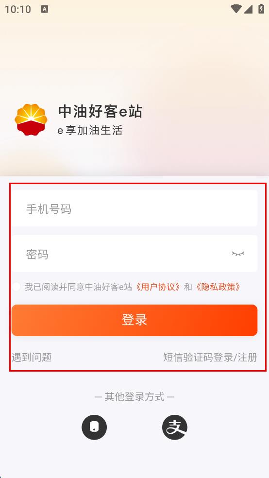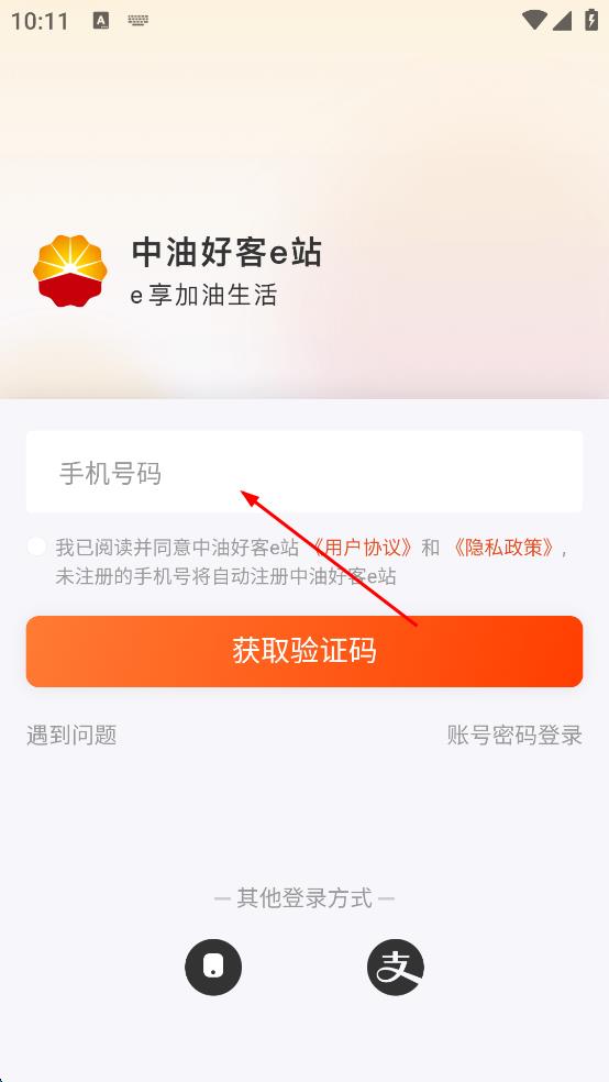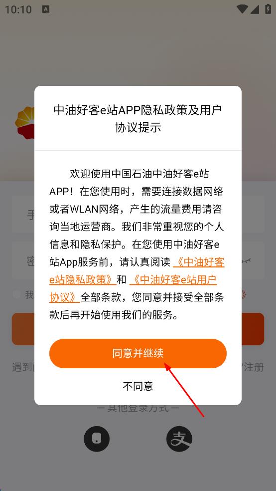 1、打開中油好客e站APP,在彈出的隱私政策及用戶協(xié)議提示框中,認真閱讀相關(guān)內(nèi)容后,點擊“同意并繼續(xù)”,進入登錄界面。