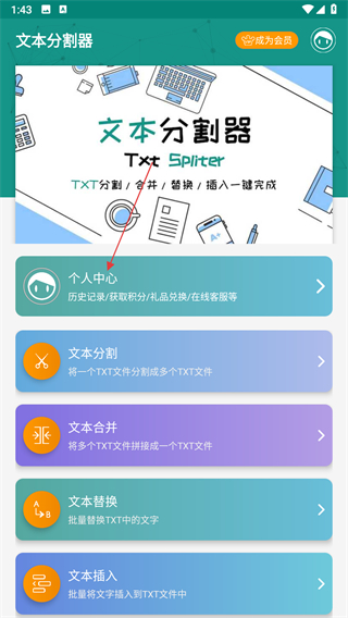 1、打開文本分割器,點(diǎn)擊個(gè)人中心,進(jìn)入功能頁面。