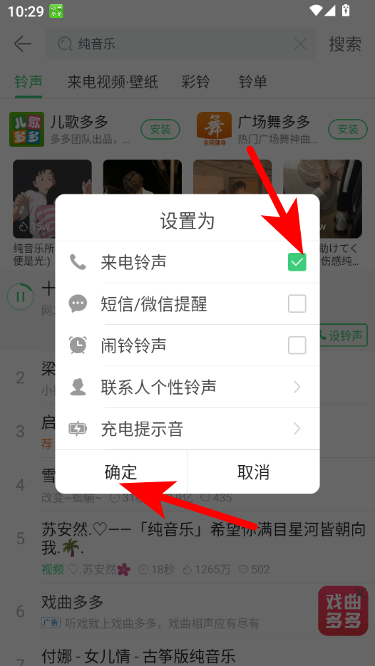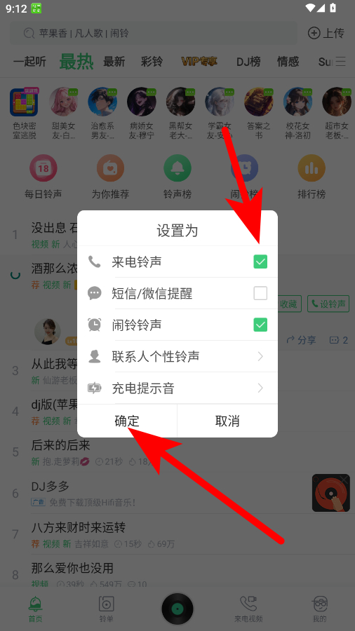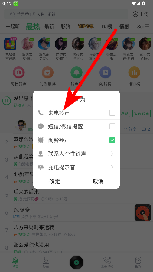 4、在設(shè)置選項框中,選擇來電鈴聲并點擊確定,即可完成來電鈴聲設(shè)置。