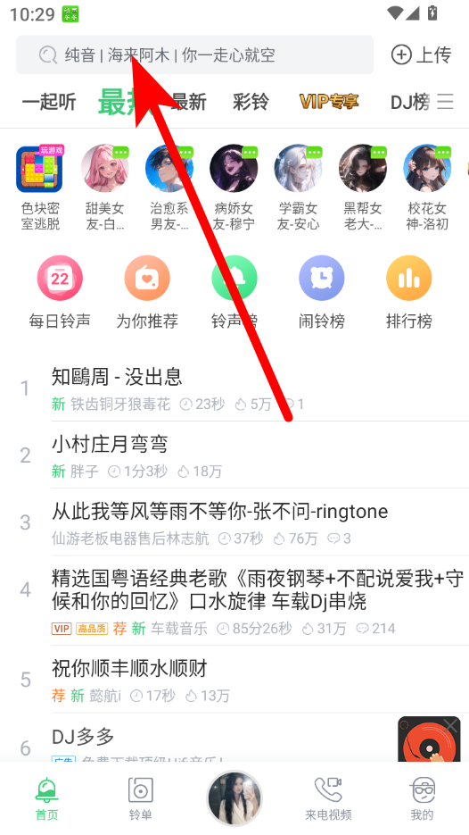 1、在鈴聲多多首頁,點擊搜索框,輸入想要設(shè)置的鈴聲關(guān)鍵詞進(jìn)行搜索。