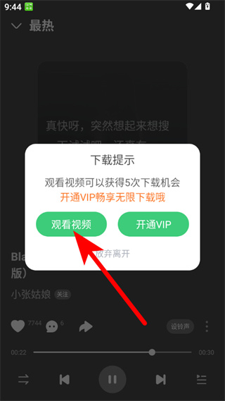 4、在下載提示框中,點擊觀看視頻按鈕,獲取下載機會后即可下載該鈴聲。