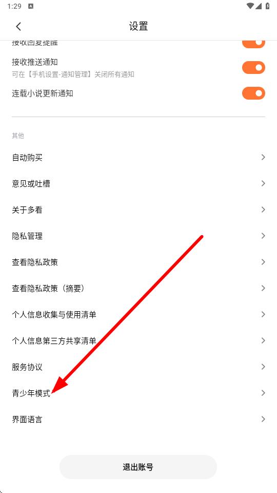 1、打開多看閱讀App進(jìn)入設(shè)置頁(yè)面,在設(shè)置選項(xiàng)中找到并點(diǎn)擊青少年模式。