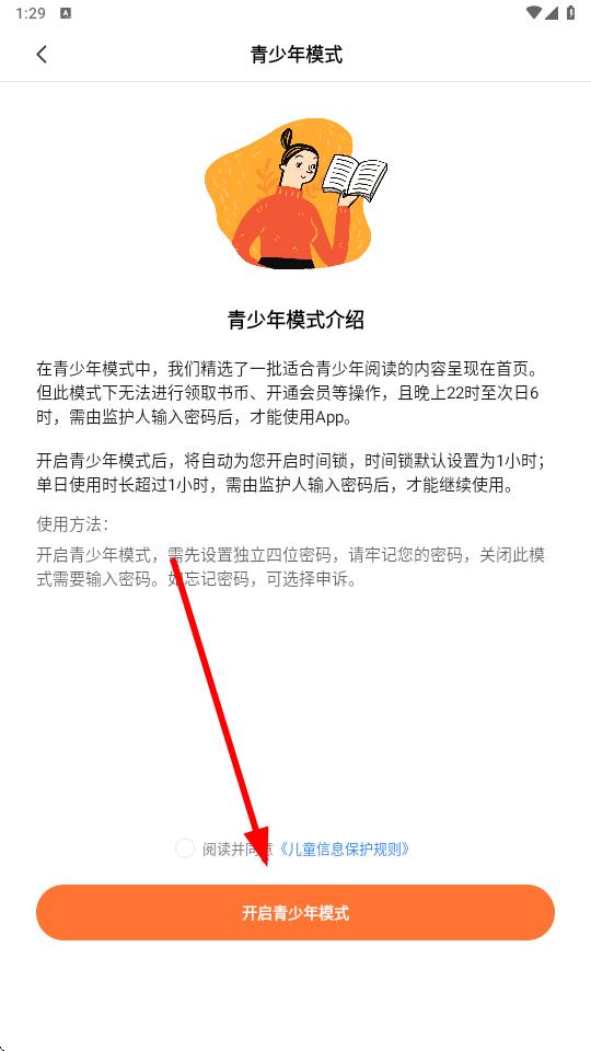 2、進(jìn)入青少年模式介紹界面,閱讀相關(guān)介紹后,勾選同意兒童信息保護(hù)規(guī)則,再點(diǎn)擊開啟青少年模式按鈕。