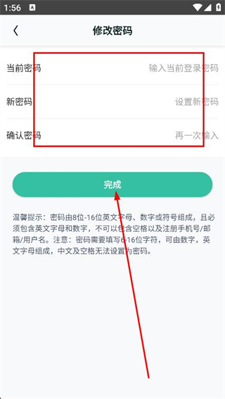 4、根據(jù)提示設置密碼,點擊完成按鈕即可修改密碼。
