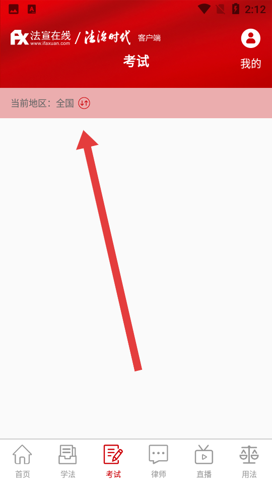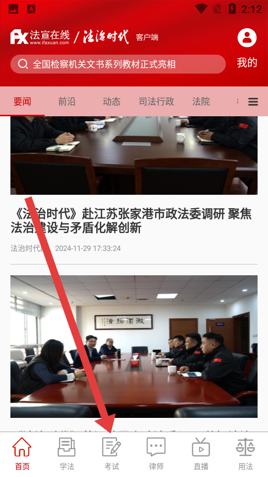 1、打開法宣在線客戶端,進(jìn)入首頁,點擊底部導(dǎo)航欄中的考試圖標(biāo),進(jìn)入考試相關(guān)頁面。
