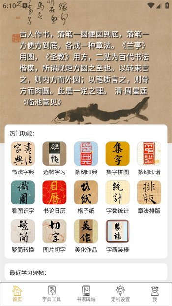 1、這里是平臺的主頁之中,一進入這里就可以看到各種不同內(nèi)容的書法功能,滿足你關于一切書法上的需求,字典、學習、識字等書寫方面的幫助;