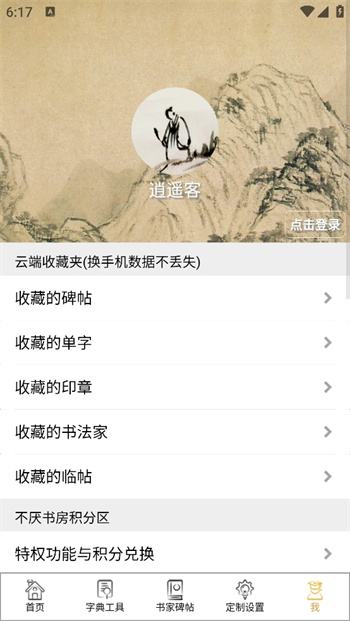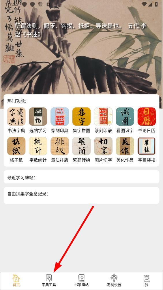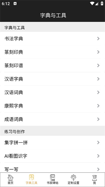 1、打開不厭書法app,點擊底部導航欄中的字典工具選項,進入字典與工具頁面。