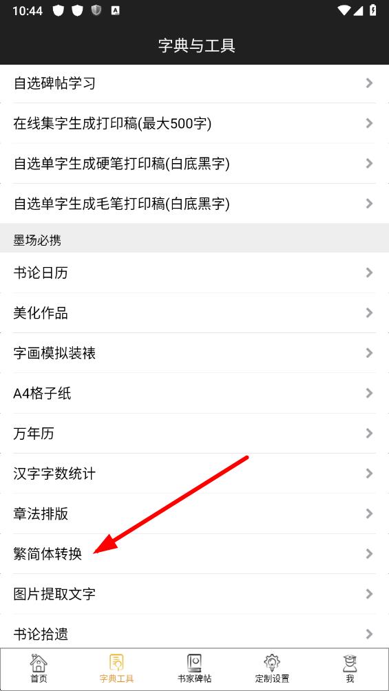 2、在字典與工具頁面中,找到并點擊繁簡體轉(zhuǎn)換選項,進入漢字繁簡體轉(zhuǎn)換界面。