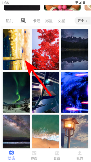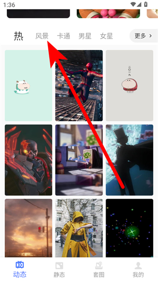 1、在壁紙APP動(dòng)態(tài)頁(yè)面,點(diǎn)擊風(fēng)景分類標(biāo)簽,進(jìn)入風(fēng)景壁紙列表頁(yè)面。
