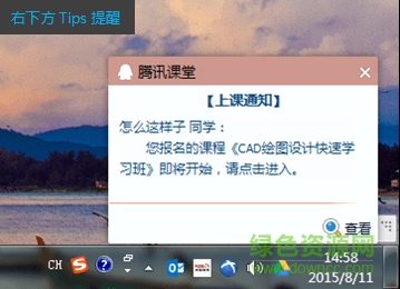 1.每當(dāng)直播任務(wù)上課前,我們會(huì)通過(guò)QQ PC版向您推送上課提醒,點(diǎn)擊上課提醒即可進(jìn)入正上課的課堂,上課提醒如下圖所示: