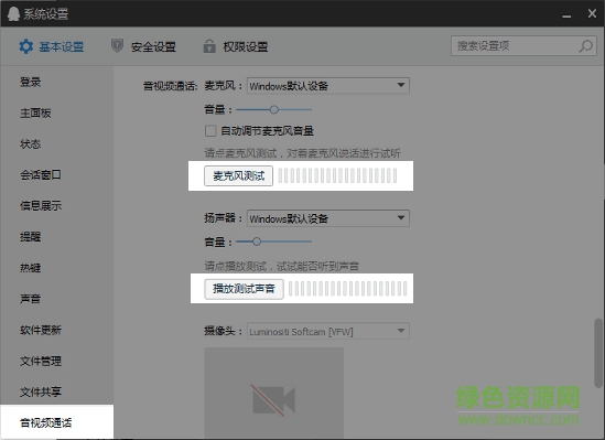 設(shè)置聲音和視頻,確保硬軟件設(shè)備正常。從QQ面板左下角點(diǎn)擊設(shè)置按鈕進(jìn)入“系統(tǒng)設(shè)置”->選擇最后一項(xiàng) “音視頻通話“。點(diǎn)擊“麥克風(fēng)測(cè)試”和“播放測(cè)試聲音”來(lái)檢測(cè)自己的麥克風(fēng)和揚(yáng)聲器/耳機(jī)是否工作正常。