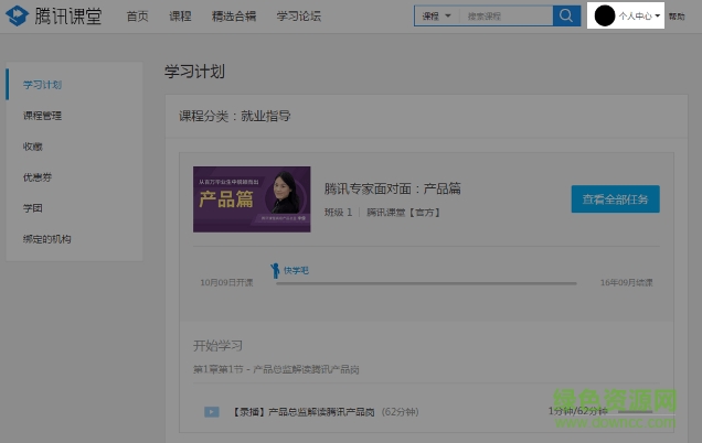 3.在ke.qq.com頂部導(dǎo)航欄的 “個(gè)人中心”-“學(xué)習(xí)計(jì)劃”中,可以看到您所有的待學(xué)習(xí)的課程,點(diǎn)擊每個(gè)課程的“查看全部任務(wù)“按鈕可進(jìn)入對(duì)應(yīng)課程的任務(wù)列表中。
