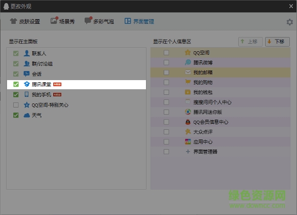 注:點(diǎn)擊更改外觀按鈕->界面管理,勾選騰訊課堂顯示在主面板即可讓主面板出現(xiàn)騰訊課堂 tab