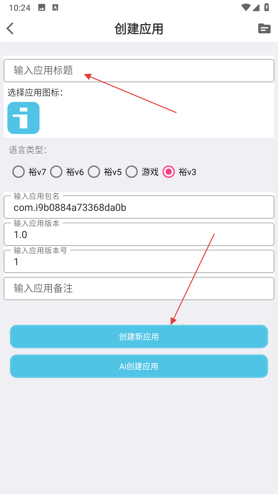 2、在創(chuàng)建應(yīng)用頁(yè)面中,輸入應(yīng)用標(biāo)題,選擇應(yīng)用圖標(biāo)、語(yǔ)言類型,確認(rèn)應(yīng)用包名、版本、版本號(hào)等信息,點(diǎn)擊創(chuàng)建新應(yīng)用按鈕。