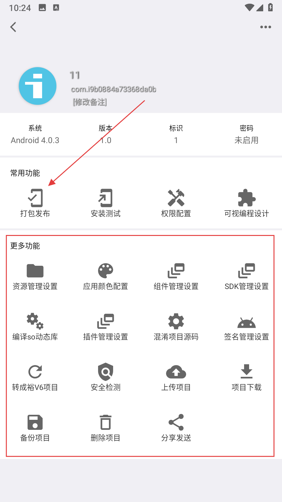 3、進(jìn)入應(yīng)用項(xiàng)目管理頁(yè)面后,可通過可視編程設(shè)計(jì)功能進(jìn)行界面布局與邏輯編寫,利用權(quán)限配置,資源管理設(shè)置等更多功能完善應(yīng)用,最后點(diǎn)擊打包發(fā)布按鈕,完成軟件制作。