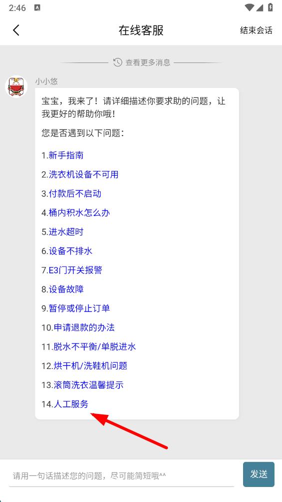 3、在線客服對話界面,查看客服給出的常見問題列表,點擊人工服務選項。