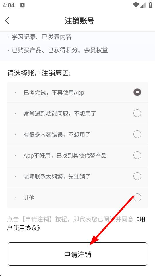 4、在頁面選擇注銷原因后點擊申請注銷,完成賬號注銷操作。