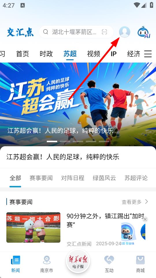 1、在交匯點新聞首頁,點擊右上角個人圖標,進入個人功能頁面。