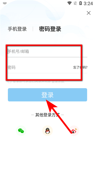4、在密碼登錄頁面,輸入手機(jī)號/郵箱和密碼后,點(diǎn)擊登錄按鈕完成賬號登錄操作。