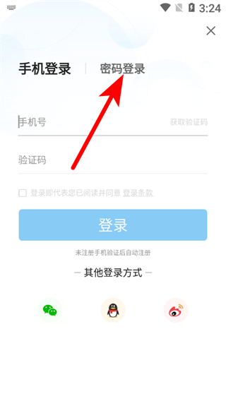 3、在登錄選擇頁面,點(diǎn)擊密碼登錄選項(xiàng),進(jìn)入密碼登錄頁面。