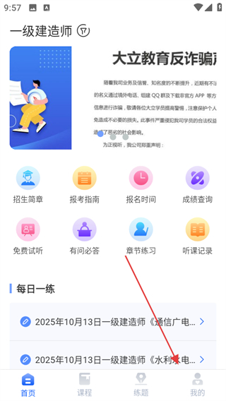 1、打開(kāi)大立教育APP,進(jìn)入首頁(yè),點(diǎn)擊底部導(dǎo)航欄中的我的選項(xiàng)。