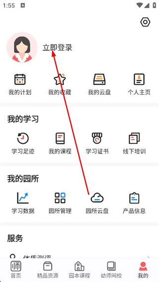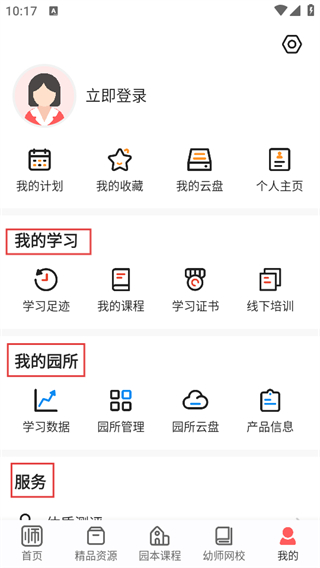 5、在我的頁(yè)面,有我的學(xué)習(xí)、我的園所、服務(wù)等板塊,方便幼師管理個(gè)人學(xué)習(xí)計(jì)劃、園所相關(guān)事務(wù)等。