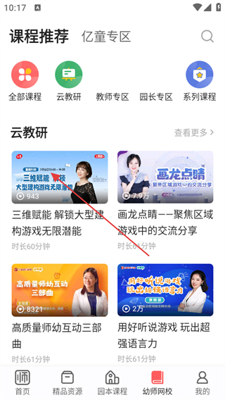 4、有課程推薦板塊,包含云教研等不同類(lèi)型的課程,如三維賦能解鎖大型建構(gòu)游戲無(wú)限潛能等,供幼師學(xué)習(xí)提升。