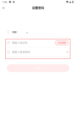 4、在設(shè)置密碼頁(yè)面輸入驗(yàn)證碼和登錄密碼,完成后點(diǎn)擊完成。