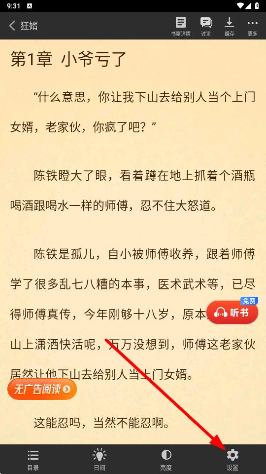 1、在追書神器小說閱讀界面,點擊底部的設(shè)置圖標(biāo)齒輪形狀。